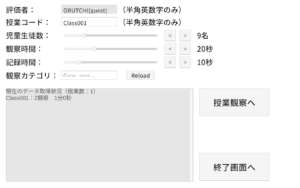 設定画面に戻ると,下記画面のように,現在取得しているデータについて「観察カテゴリ」下部のウィンドウに表示されます。続いて別の授業を観察する場合には,授業コードを変更した上で「授業観察へ」ボタンをタップして下さい。アプリを終了する場合には,「終了画面へ」ボタンをタップして下さい。