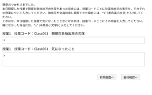 「終了画面へ」ボタンをタップすると,下記画面のように,特記事項を入力する画面が表示されます。観察した授業ごとに,「観察対象抽出時の欠席」や「気になったこと」について,改行せずにテキストを入力して下さい。