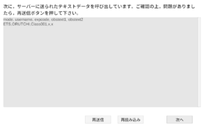 「次へ」ボタンをタップすると,下記画面のように,サーバーに送信されたテキストデータの確認画面が表示されます。特に問題が無ければ「次へ」ボタンをタップして下さい。