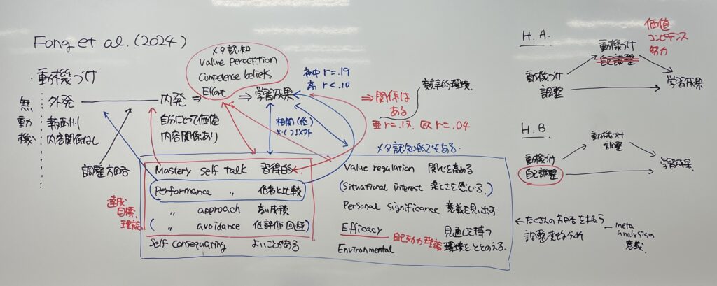 (1) Mastery self-talk (マスタリー目標を高めようとする), (2) Performance self-talk (他者より秀でようとする), (3) Performance-approach (高い成績を取ろうとする), (4) Performance-avoidance (低評価を回避する), (5) Self-consequating (外的報酬としてよいことがあると思う), (6) Value regulation (課題に価値を見いだそうとする), (7) Personal significance (自分にとっての意義を見いだそうとする), (8) Situational interest (楽しい部分に着目する), (9) EfFicacy enhancement (見通しを持ちやすくするための目標管理), (10) Environment regulation (学習環境の整備や管理) といった動機づけ調整方略の利用頻度と学習成果,動機づけ,自己調整との関係について,55本の論文を対象としたメタ分析を行って検討した。なお,この論文で言うところの動機づけは学習意欲と呼ばれるものに近いと思われる。上記(1)から(10)までの方略のうち,動機づけ及び自己調整との間には全て有意な相関が見られたが,学習成果に関しては(4),(7)との間には相関は見られず,(1)から(3),(5),(6),(8)から(10)との間の相関も低いものであった。また,著者らは収集した論文から得たデータを用いて,(a) 動機づけ的方略の利用が動機づけや自己調整を媒介し学習成果を高めるモデル,(b)動機づけや自己調整を行えることが動機づけ的調整を媒介して学習成果を高めるモデルの2つを検討した。その結果,動機づけ的調整によって有能感,内発的な価値観,努力といったmotivational beliefsが高まり学習成果に影響すること(aが採択),メタ認知的方略の使用及び環境整備や管理を行う頻度が動機づけ的調整を媒介して学習成果に影響する(bが採択)ことが示された。これは,動機づけ的調整を行うことができるのはメタ認知能力が高い学習者であるといったことを示唆すると思われる。
