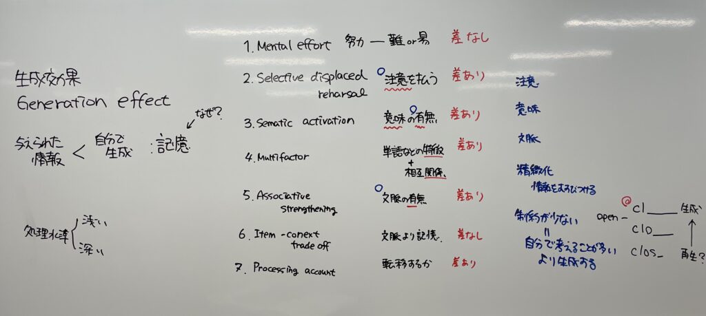 記憶すべき情報は単に与えられる(与えられて読むだけ)よりも自身が生成 (generate) したほうが保持されやすいという現象のことを生成効果というが,なぜこのような現象が起こるのかについてはいくつかの仮説が示されているものの,十分に明らかになっていない。この論文では生成効果の検証を行った論文126本(実験数310,指標数1,653)を対象としたメタ分析を行い,平均的には単に読んだ場合(d=0.48)と比べて生成した場合(d=0.58) の方が保持されやすいことが示された。さらに,このような現象に対する Mental effort (努力するので保持されやすい),Selective displaced rehearsal (注意を向けるので保持されやすい),Semantic activation (意味がある内容なので保持されやすい),Multifactor (単語などの情報の特徴と相互関係を把握するので保持されやすい),Associative strengthening (文脈があるので保持されやすい),Item-context trade-off (文脈があるので保持されにくい),Processing account (転移が生じるので保持されやすい) といった諸仮説別に(各研究は仮説に沿った実験を行っている)メタ分析を行った結果,Mental effort 仮説,Item-context trade-off 仮説については単に読んだ場合と生成した場合との間に差は無いことが示された。加えて,生成の際の処理の仕方に着目して調整変数分析を行った結果,精緻化方略を使うことや,生成の際の制約が少ないことがより効果的であることが示された。講義では,最近生成AIによって論文をはじめとしたさまざまな情報をまとめてこれらの内容を概略的に把握しようとすることがよく行われるが,そのようなことを行う利点と難点について,本研究の知見を踏まえて議論した。