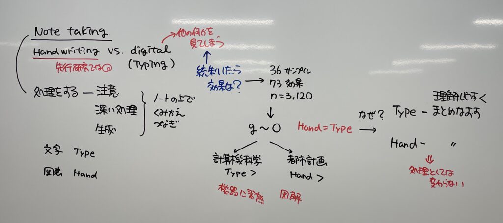 ノートテイキングは記録するだけでなく,情報の再構成や知識の生成・整理に寄与するという理論的背景がある。先行研究でのメタ分析の結果では,手書きの方がタイピングと比べて効果があることが示されているが,タイピングの場合にはコンピュータを用いるため他の何か(インターネットのブラウジングなど)を見てしまうということが起こり,このような状況を統制できていなかったという問題がある。この研究では36本の研究,73効果指標,総対象者数3,120人のメタ分析を行い,手書きとタイピングによるノートテイキングの効果の違いを検討した。その結果,手書きとタイピングによるノートテイキングの効果の違いは見られなかった。調整変数分析として,計算機科学の学習の場合にはタイピングの方が,都市計画の学習の場合には手書きの方が効果が高いことが示されたものの,それ以外の内容については効果の違いは見られなかった。手書きであってもタイピングであっても,理解しやすくまとめ直すといったことにともなう処理に大きな違いはないためと考えられる。