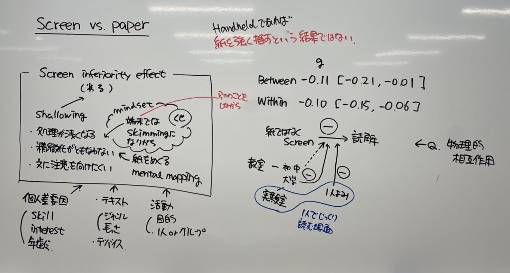 講義では,この知見は screen inferiority effect が起こることは示唆しているものの,それほど大きな違いではないのではといったことや,たとえば介入AとBではBの方が負の主効果が見られるものの効果自体が大きくないといった場合にそれでもBを実施するという意思決定の是非について議論した。