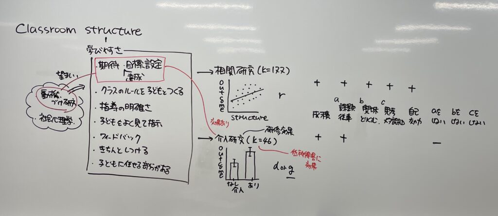 相関研究のメタ分析では,Classroom structure を構成する要因として,期待・達成目標設定,クラスルールを児童生徒とつくる,教師の指導の明確さ,教師が自動生徒をよく見て指示する,フィードバック,確実なしつけ,子どもに任せる部分がある,といったことを仮定し,これらが満たされるほど課題従事行動,興味を持って取り組むこと,メタ認知的方略の使用,学習成果が高いことが示された。教師を対象に児童生徒が学びやすい classroom structure を構成できるようにするための研修を行い,研修受講有無のクラス間の比較を行う介入研究では,研修受講教師クラスの方が課題従事行動が多く,非課題従事行動が少なく,学習成果が高いことが示された。