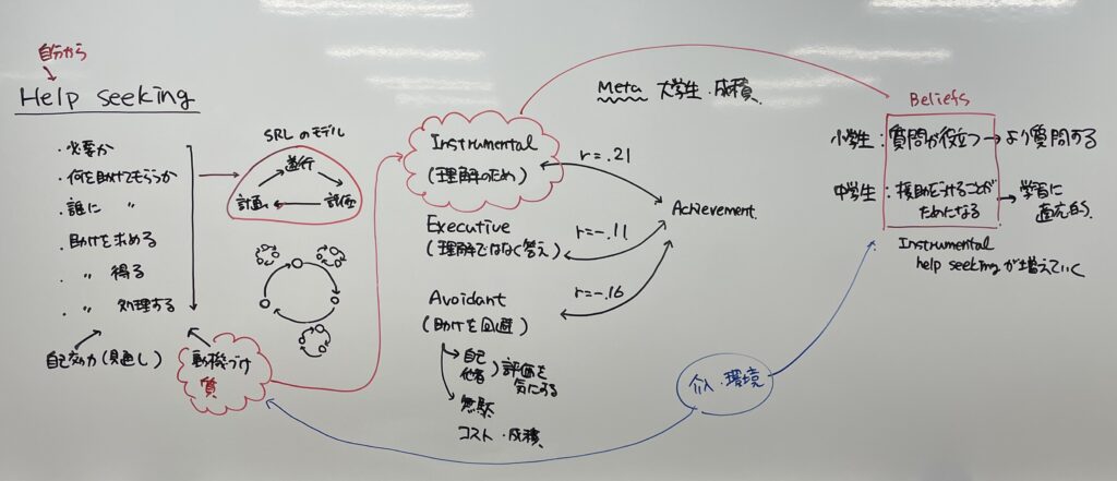 学業的援助要請は重要な学習方略の一つである。また,援助要請を求めるには,援助要請が必要か,何を援助してもらうのか,誰に援助してもらうのかといったことを考慮した上で,実際に援助を求め,これを得て処理をするという段階を踏むことから,問題解決に必要な情報や援助を他者に求める能動的な行動であるという点で自己調整学習の構成要素の一つでもある。援助要請には instrumental(学習内容の理解を深めるため),exuecutive(問題の正しい答えや解決策を得ることを目的とし概念やプロセスを理解するための努力は最小限),avoidant(支援を求めることを避ける)といった種類があり,学業成績に対する効果もことなると考えられる。援助を回避するということは,援助の必要が無いという場合だけでなく,自尊心が傷つくと思ったり,コスト(気を遣う)を認知したり,他者からできない人と見られると思ったり,学業成績自体が低く援助を求めようにも何を求めればよいのかが分からないといったことによってもたらされる。