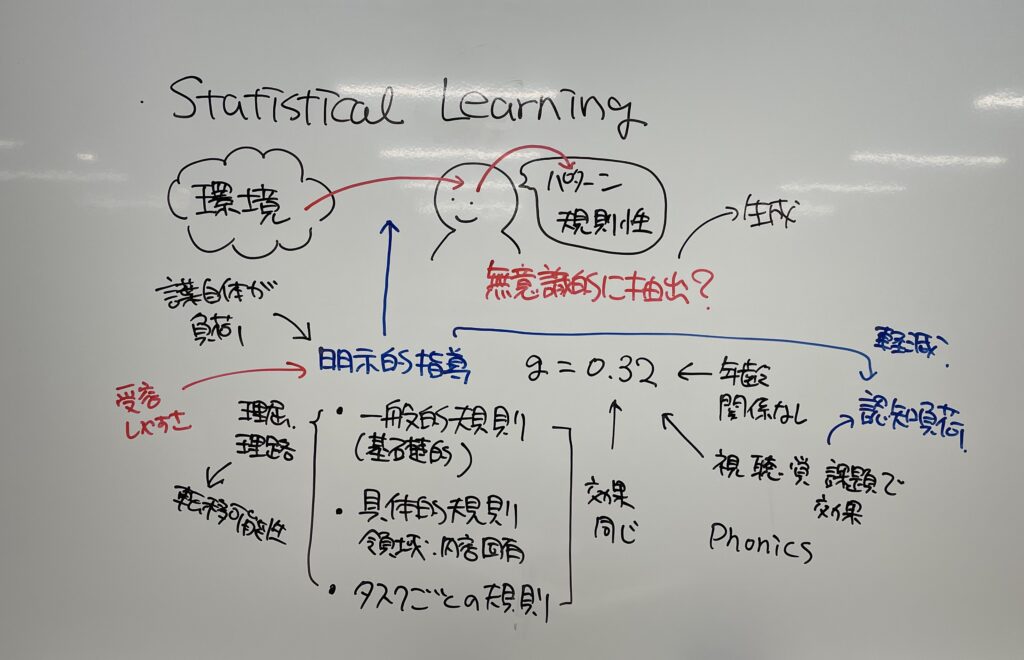Statistical learning (環境から繰り返されるパターンや規則性を抽出する学習)は,無意識的かつ自動的に行われるプロセスと考えられてきたが,最近では明示的な指導によって statistical learning が促進される可能性が指摘されている。46論文,172研究サンプルを対象に行ったメタ分析の結果,明示的指導が statistical learning の成果に与える平均的な効果は g=0.49であることが示された。明示的指導には一般的規則,具体的規則,課題ごとの規則を指導する場合があるが,これらの種類による効果の違いは調整変数分析の結果示されなかった。また,年齢による効果の差も見られなかった。明示的指導は学習課題に選択的注意を向けさせたり,特定のパターンや規則を明確に強調することで認知負荷を軽減するために効果が見られると考えられる。
