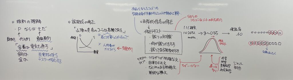 教育心理学で研究されてきた規則の理解や誤概念の修正に関する研究知見を紹介したうえで,この論文のテーマである科学的に誤った信念の修正について検討した。この論文では,インターネットやSNSを通じて誤った科学情報が広く拡散しており,教育や科学リテラシーに深刻な影響を与えているという問題意識のもとで,科学的に誤った信念の修正のため用いる修正テキストの効果についてのメタ分析を行っている。修正テキストとは,相手の誤った知識を示し,何が誤りであるのかを指摘し,誤りである根拠を示すテキストのことである。111研究サンプル,総対象者数10265人を対象にメタ分析を行った結果,平均的な効果はg≈0.35であった。調整変数分析の結果,テキストのタイプ(つながりが明確な文,因果を示す文,馴染みのある例を用いた文,単純な構文による文)や領域(化学,地学,生命化学,社会科学)による違いは見られなかった。この結果から修正テキストは効果があるといえるものの,論文中で言及されているように,単に修正テキストを与えることだけで解決しようとするのではなく,学習者自身が学習活動を行い自ら情報を処理する経験をすることの方が教育的には重要であるという点には留意すべきである。また,g≈0.35は優越率でいうと60%程度である(50%でeven)ということも考慮すると,修正テキストを与えても,科学的に誤った信念を実際に修正できる人はそう多くはないという点を講義で指摘した。